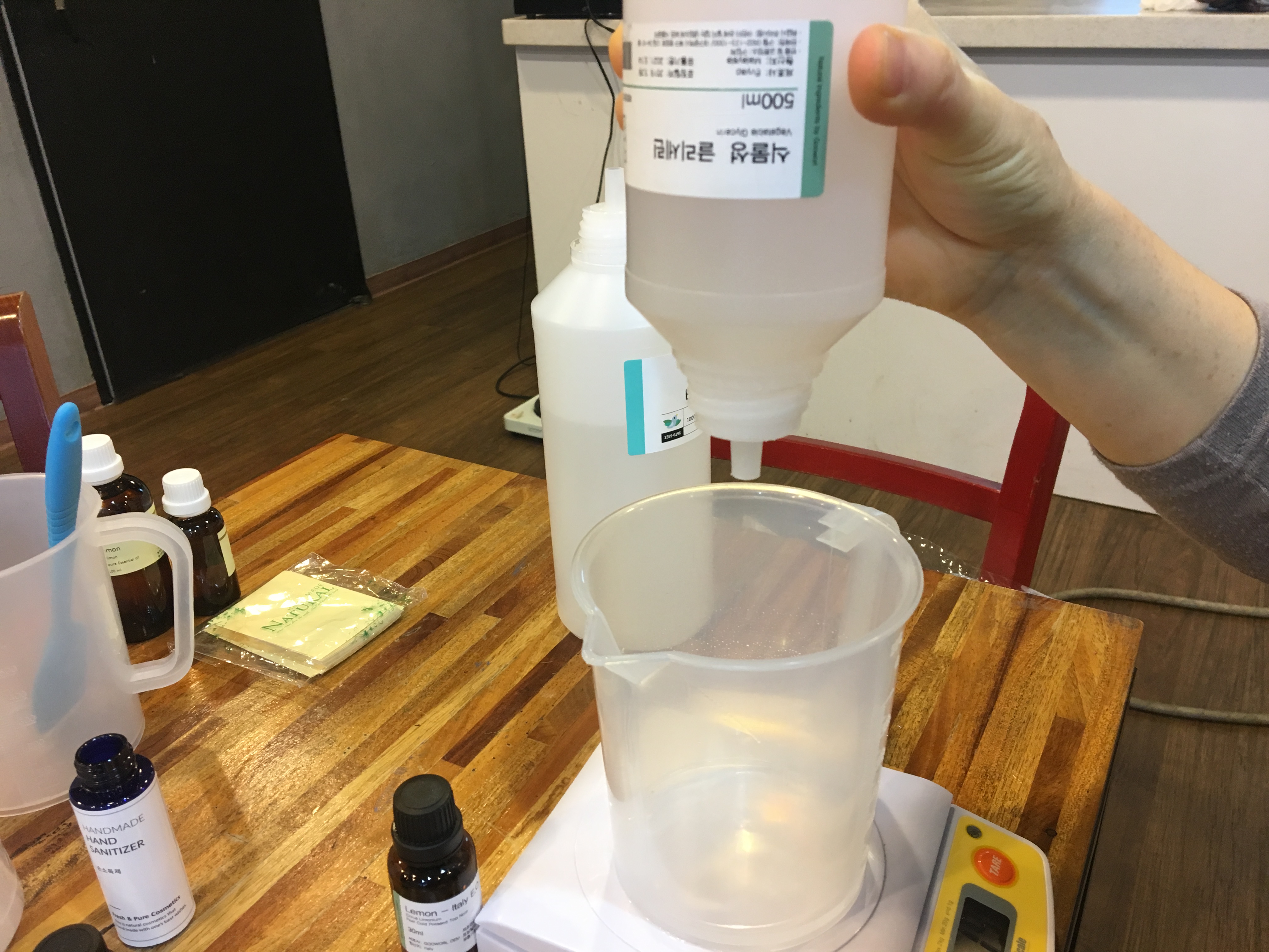 최고의 소독효과를 위해 전체 분량의 70%의 애탄올 함량을 유지하도록 에탄올80 90g에 글리세린 10g을 섞고 레몬 5방울 티트리 5방울을 넣었다